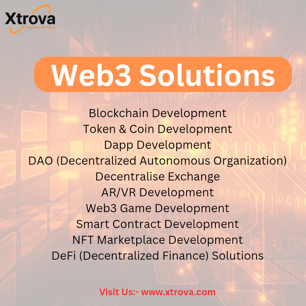 Xtrova delivers cutting-edge Web3 solutions including blockchain, token, Dapp, DAO, decentralized exchange, AR/VR, Web3 gaming, smart contracts, NFT marketplace, and DeFi services, empowering businesses with secure, transparent, and future-ready decentralized digital ecosystems.