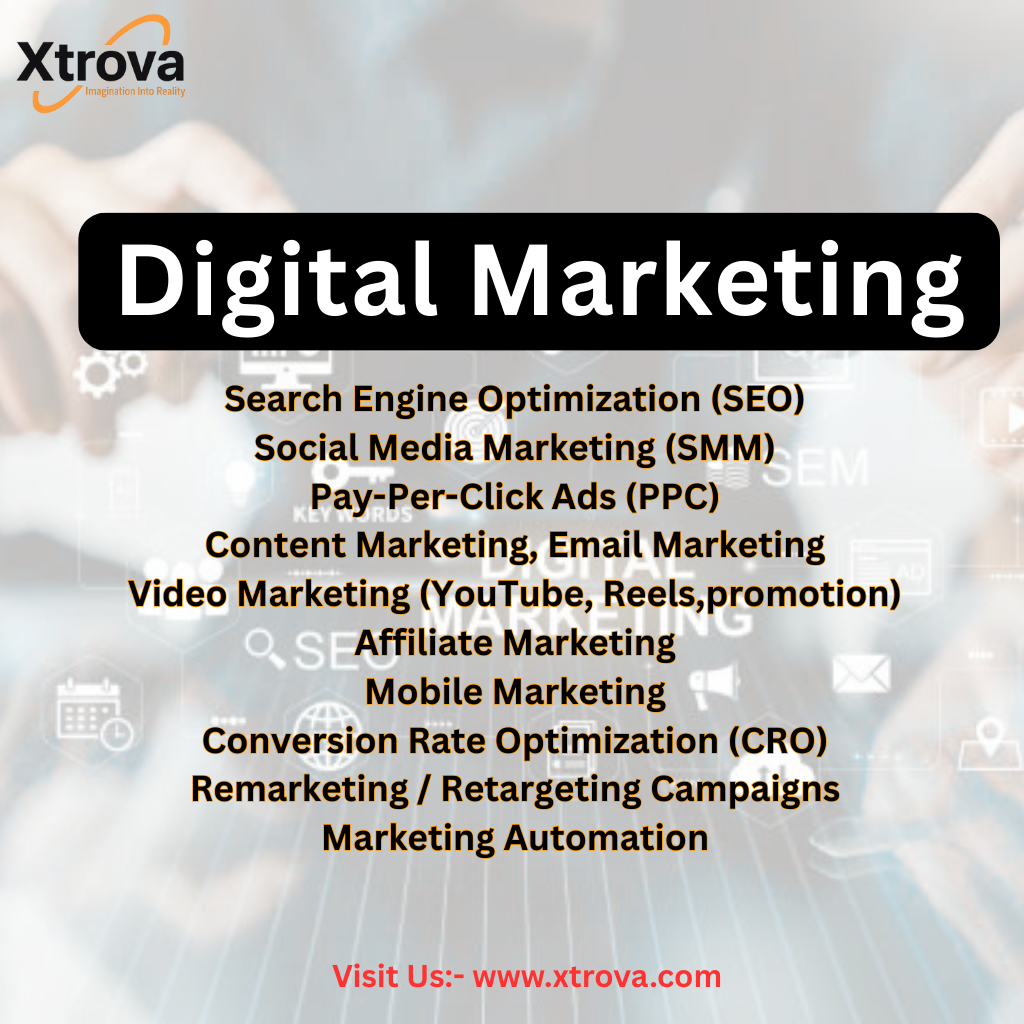 Call NowXtrova offers comprehensive digital marketing solutions including SEO, SMM, PPC, content and email marketing, video promotion, affiliate marketing, CRO, remarketing, mobile marketing, and automation, driving brand growth, visibility, leads, and measurable business success.